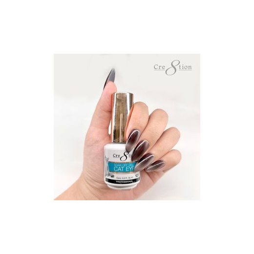 Cre8tion Cat Eye Soak off Gel has magnetic pigments that can be shaped to your desire for a purr-fectly seductive flare.