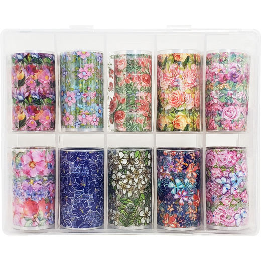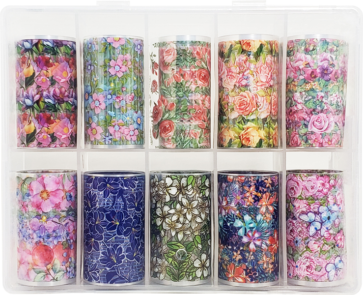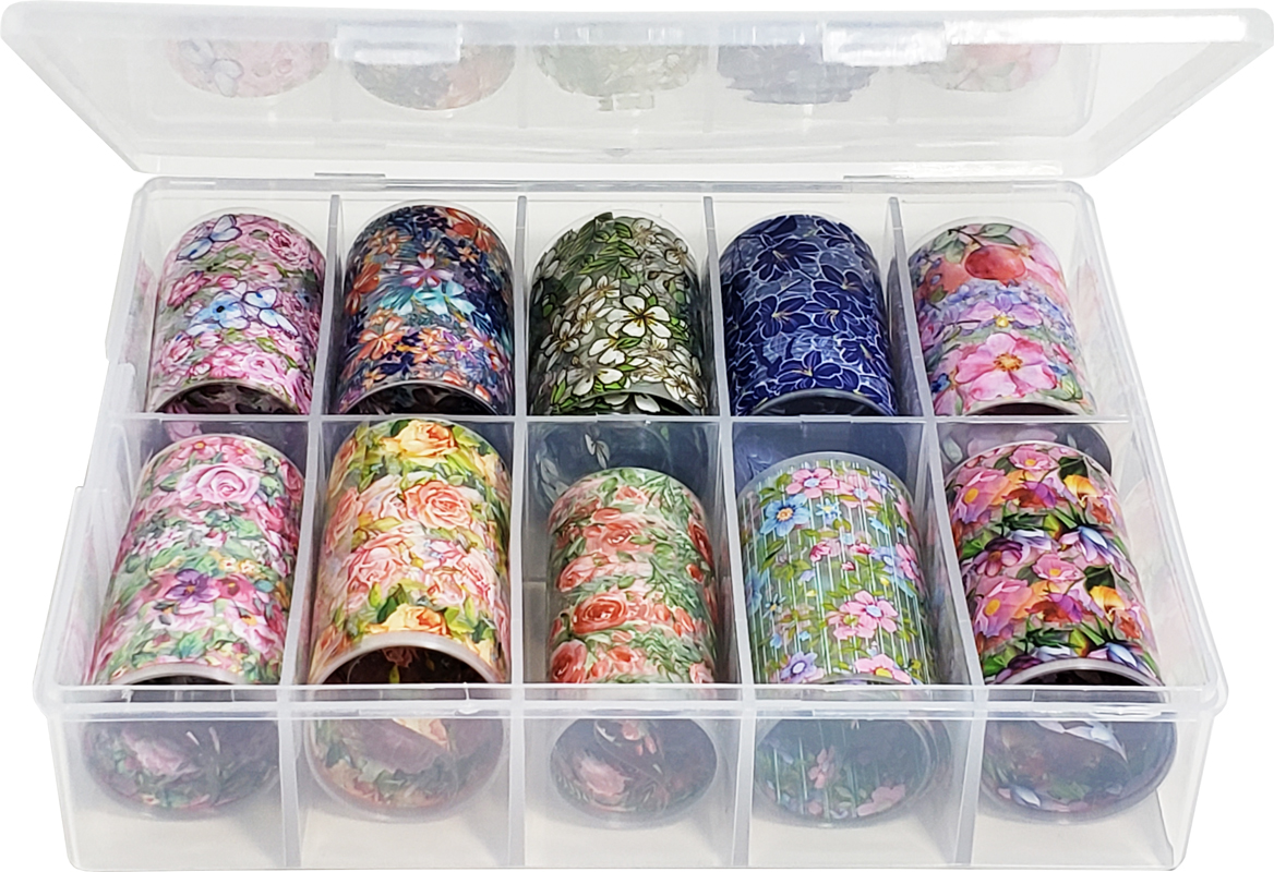 10 Different Foil Design Nail Arts in a plastic box.